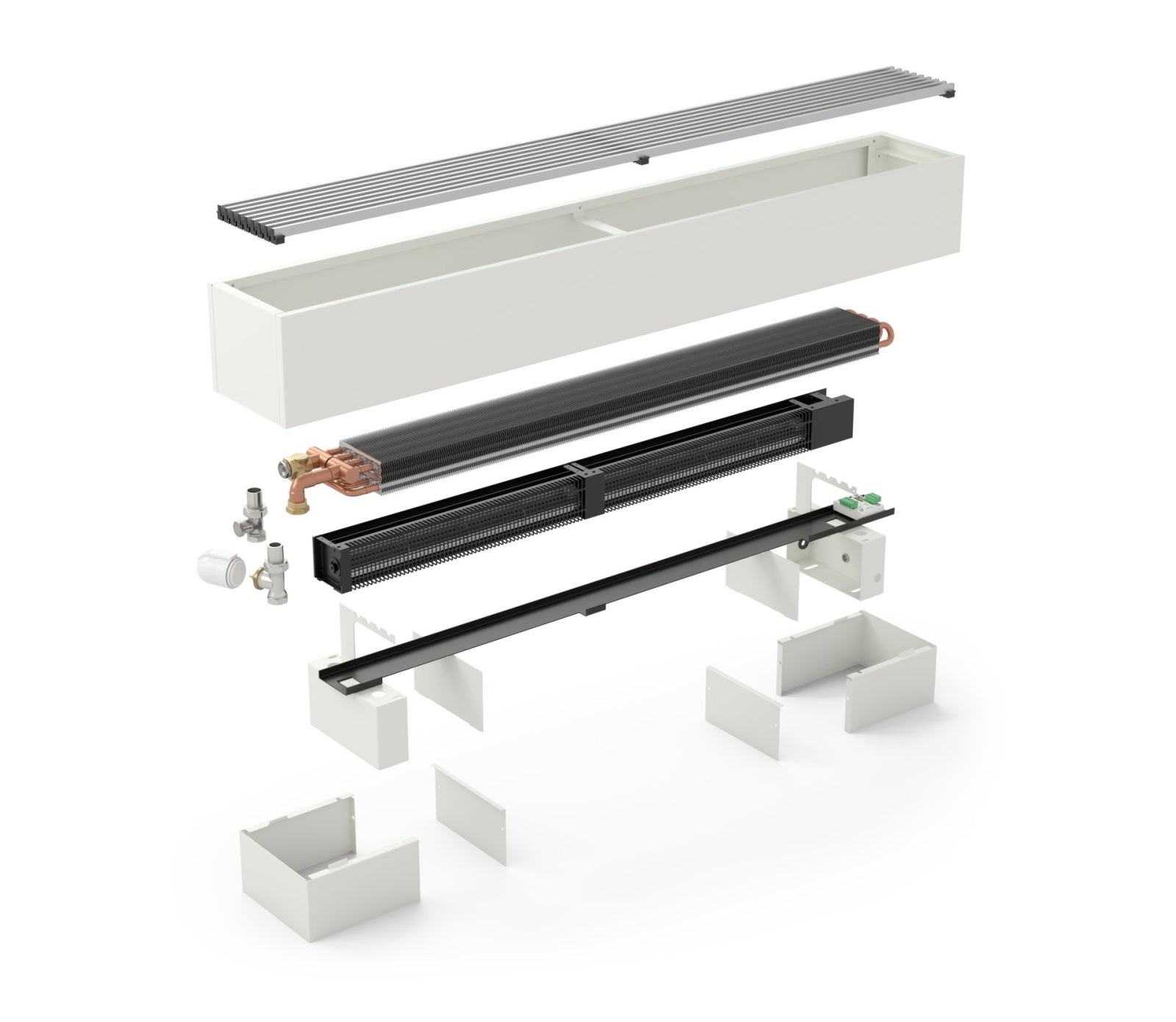 Lieferumfang: Standheizkörper KORALINE Optimal-V LVO, integrierte Lüftereinheit, Anschluss-Set und stabile Standfüße für den Fertigfußboden.
