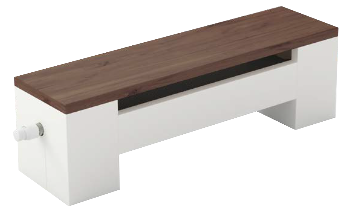 Lieferumfang: Komplettsystem inkl. behandelter Nussbaum-Platte, Edelstahl-Verkleidung, thermostatischem Axialventil und Montage-Set für den Fertigfußboden.